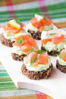 Besmeer de stukjes brood met avocadopuree. Leg er een stukje vis op en bestrooi met wat fijngehakte dille.