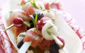 Steek radijs, meloen, mozzarella en olijven aan spiesjes.