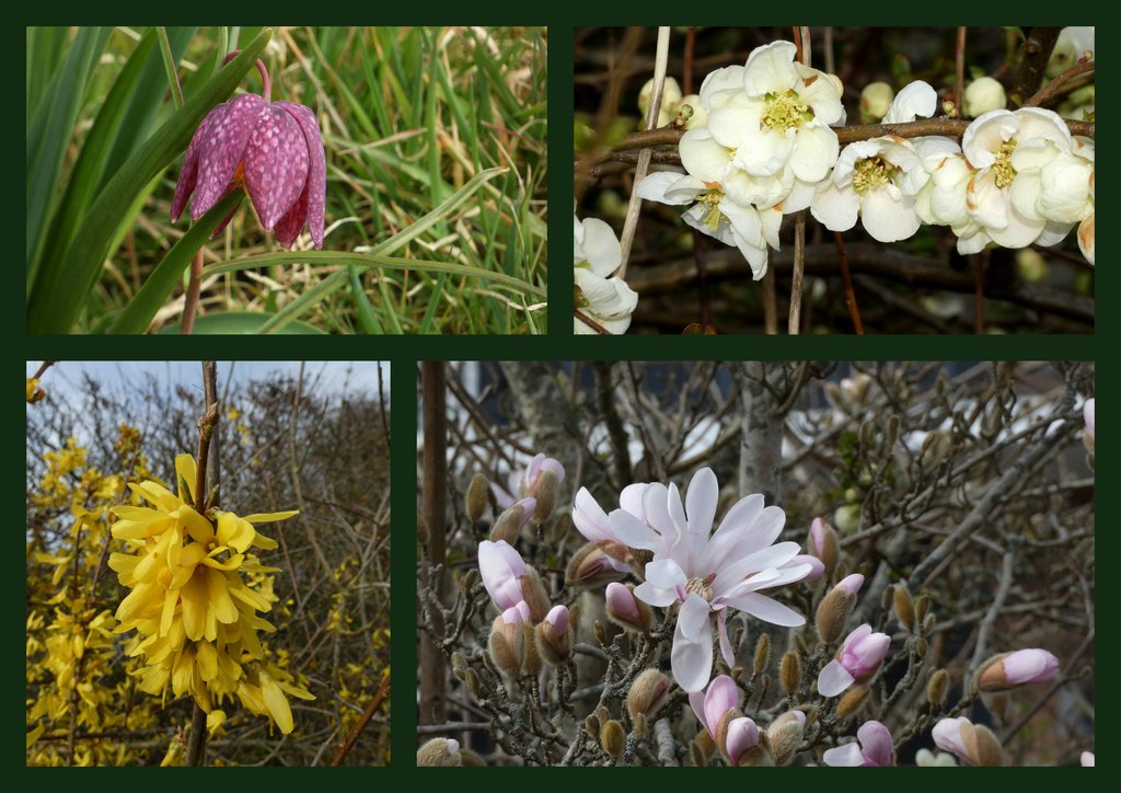 Gisterenmiddag was het hier heerlijk weer , tijdens mijn fietstochtje weer veel mooie bloemen gezien . Eerste collage : Kievitsbloem , witte dwergkwee, forsythia en stermagnolia .