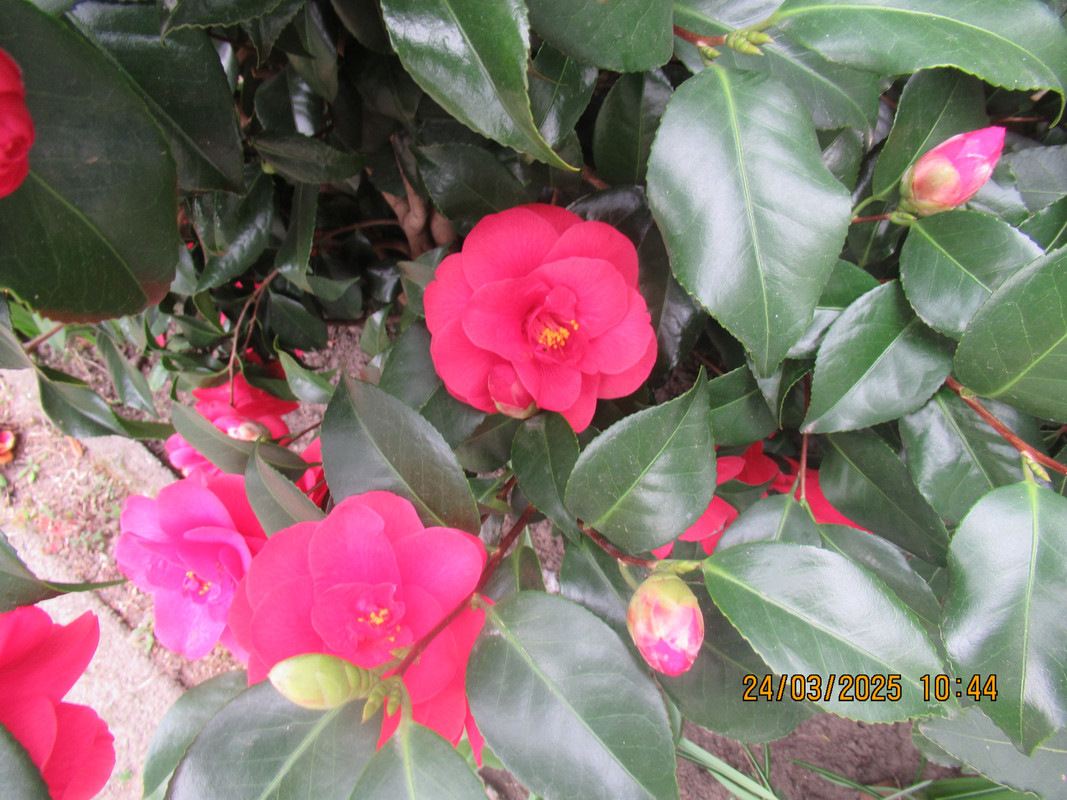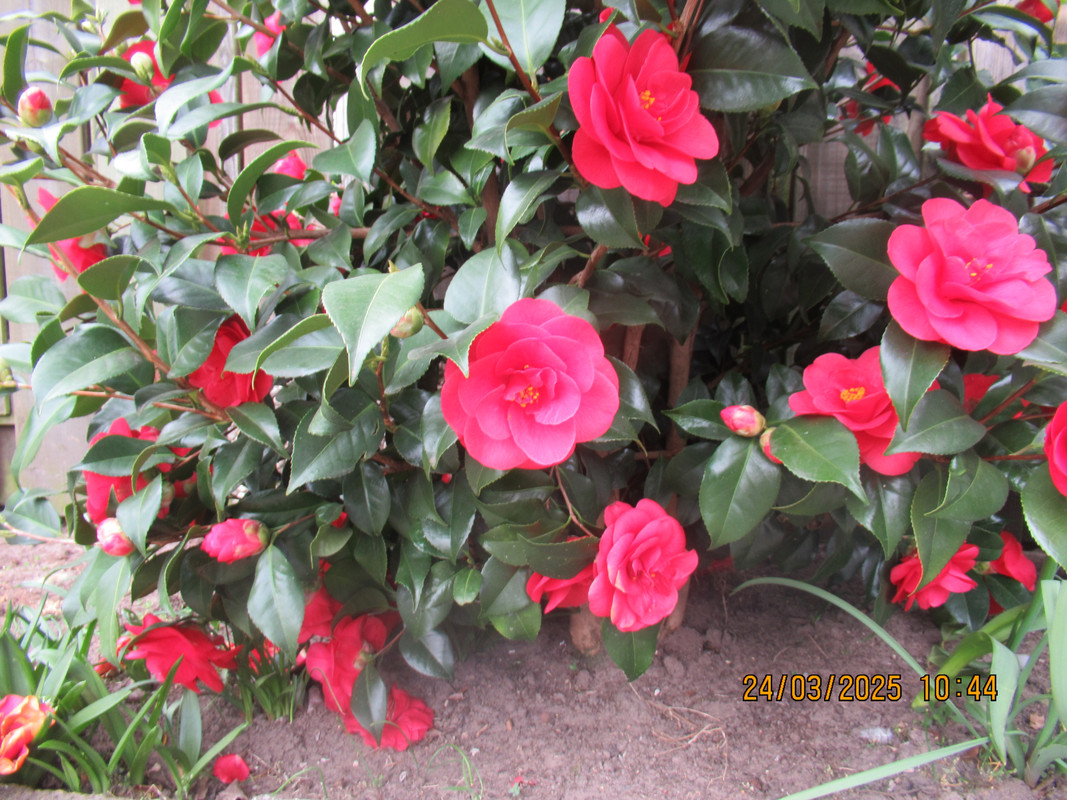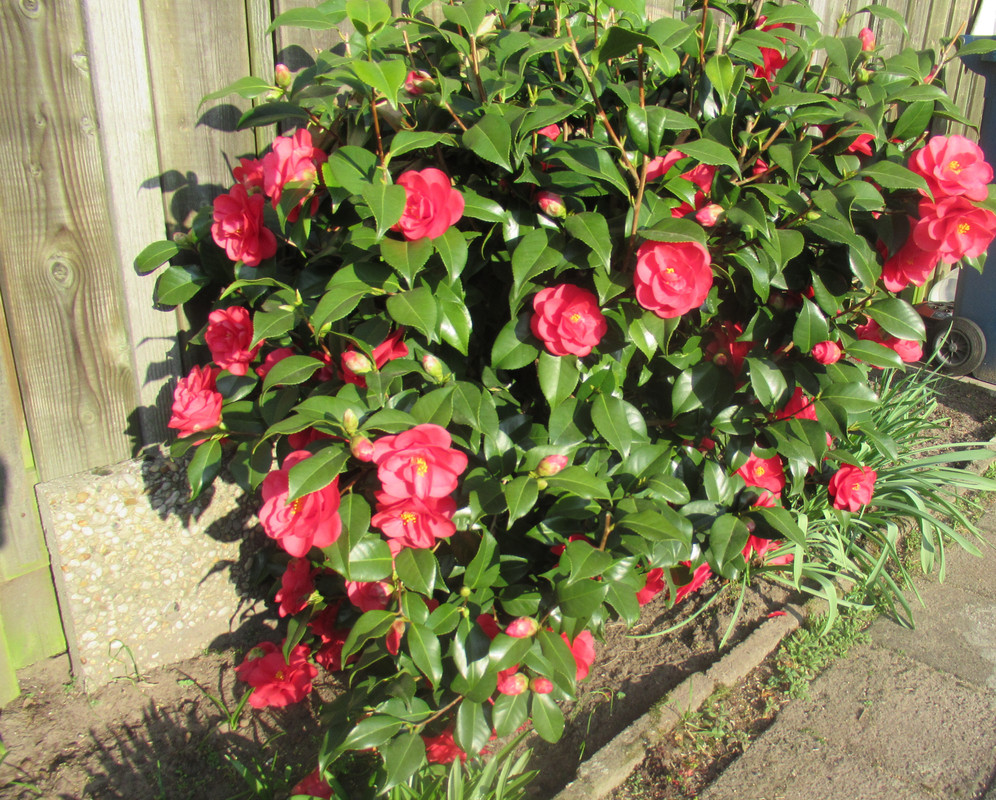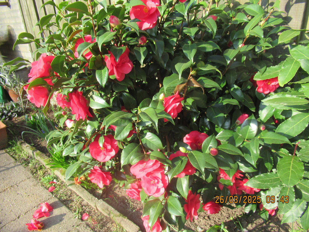 Sibille, speciaal heb ik vanmorgen foto's gemaakt van mijn cameliastruik. Die staat op he moment barstend vol. Niet te geloven. Een jaar of 5 geleden heb ik veengrond er aan toegevoegd en twee jaar geleden wat kunstmestkorrels.