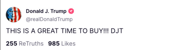 Enkele minuten na de openingsbel van de New York Stock Exchange kondigde Trump aan: "DIT IS EEN GEWELDIG TIJDSTIP OM TE KOPEN!!!"