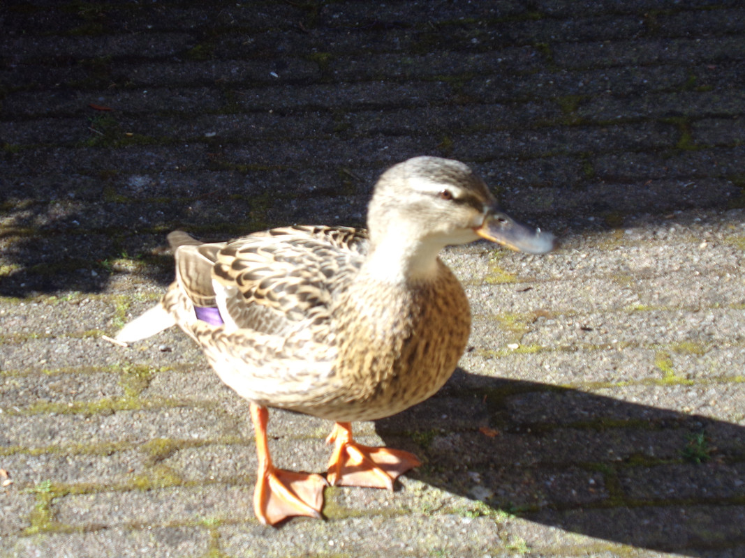 Mooie foto van de eend en wat staat de scheefbloem mooi in bloei onder de tafel
