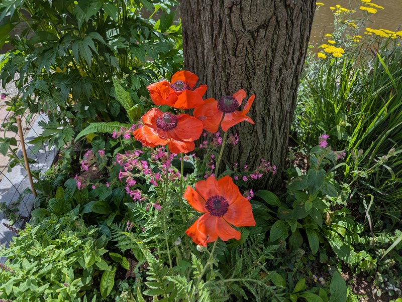 Wat een mooi kleurrijk gebeuren rondom de boom .Wow wat een waterval van bloemetjes laat de geranium zien , mooie kleur hebben ze .