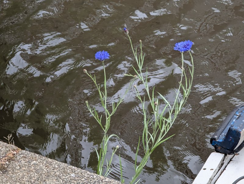 Hier aan de gracht vlak voor de deur groeit tegen de kadewand deze korenbloem, nooit eerder gezien hier