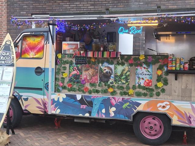 Wat een kleurrijke foodtruck staat er op je supermooie foto , en prachtig je foto van de dahlia op de felicitatiekaart .