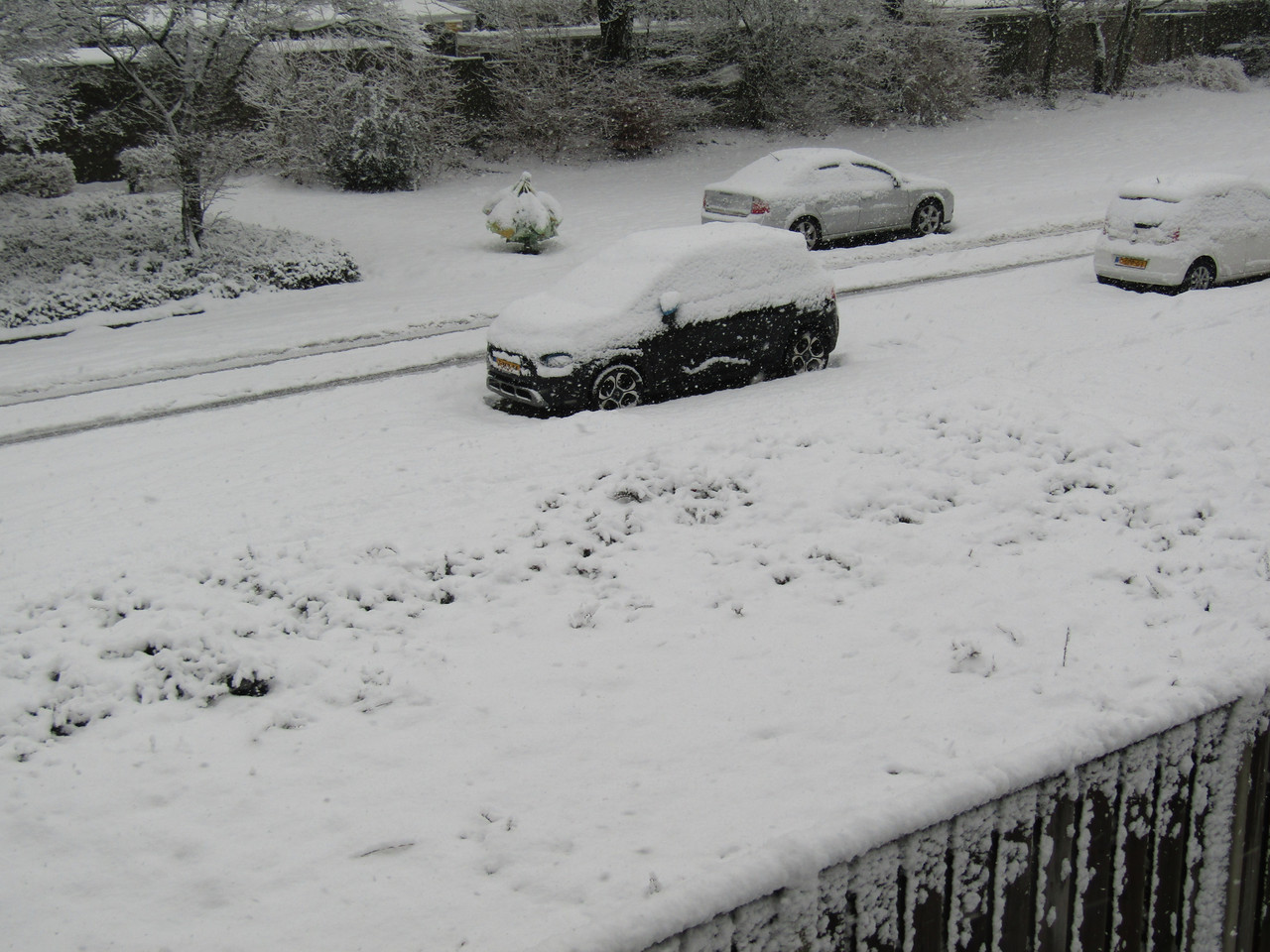 Onze autootjes. Met de Caddy, de witte, was ik gisteren nog weggeweest en die was daarna helemaal sneeuwvrij. Moet je nu zien...