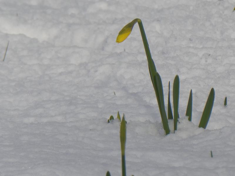 Zie ik nu bij Joke een narcis in de sneeuw? Dat komt waarschijnlijk omdat het eerst zo zacht was, het leek wel lente. Hopelijk overleeft die narcis de sneeuw. Wel heel apart hoor.