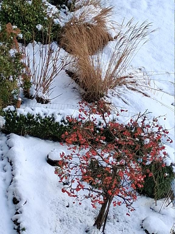 Het sneeuwt hier nog steeds, het zijn wel buien want af en toe schijnt ook de zon, heel apart. Vanuit de appartementen is het een mooi gezicht, die witte wereld. Ook hier in de tuin oogt het mooi. Het paadje is al weer dicht gesneeuwd en alles is bedekt met een dikke witte laag. In geen jaren zo'n sneeuwtoestand gezien. Mijn snowboots komen nu weer goed van pas, er zit een goede grip onder.