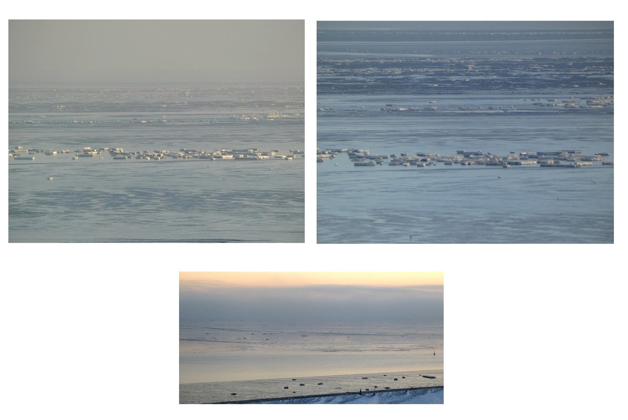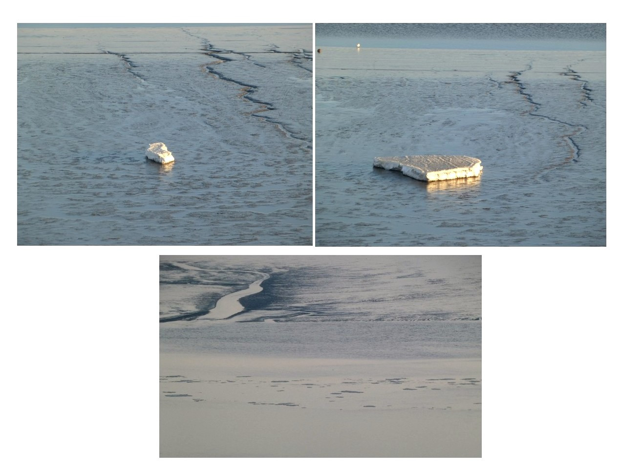 IJsschotsen op het droogliggende wad. Op de derde foto zie je in het lichtgrijze donkere stukken / stukjes dat zijn ijsschotsen die in de vaargeul drijven .