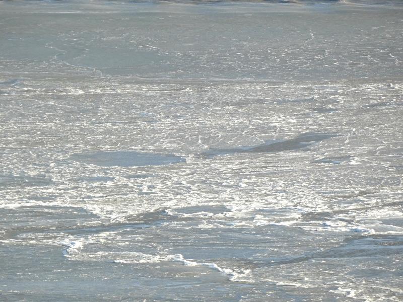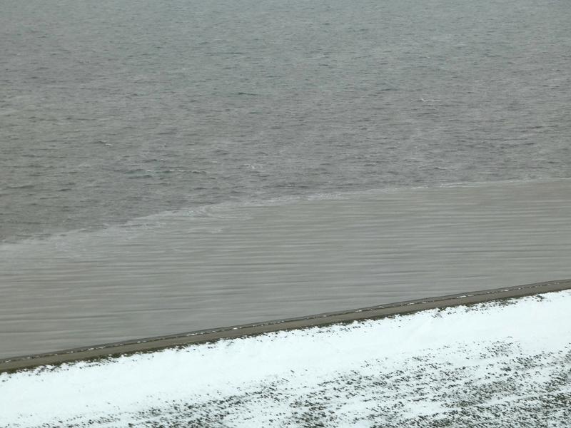 een lagen foto , te weten van boven naar beneden : Water , ijs , schoon fiets pad en sneeuw. |