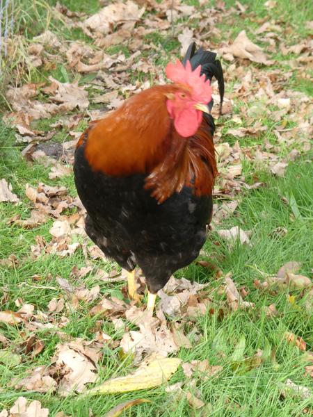 Mooi dat de kippen en de haan vrij rond kunnen lopen . |