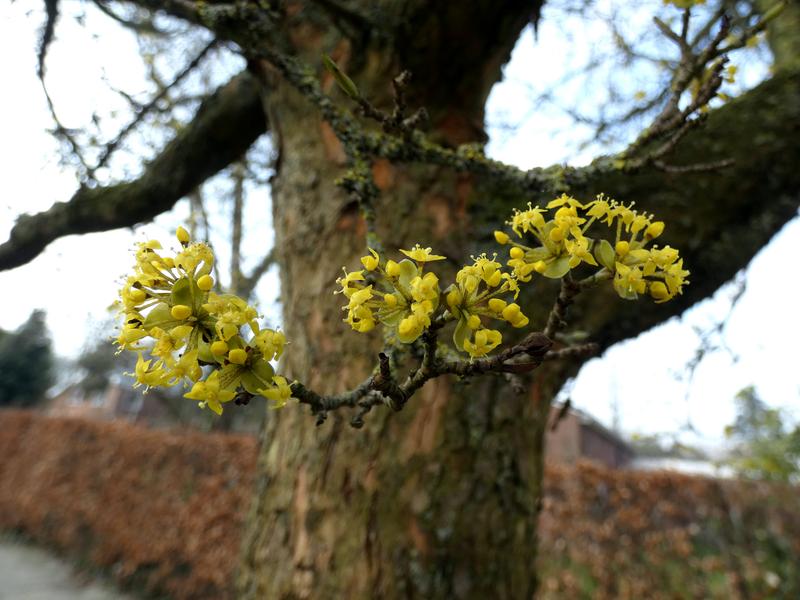 Ik kende alleen de rode Kornoelje waarvan de rode takken alleen sierwaarde hebben, de Gele Kornoelje in bloei te zien is prachtig Greet!