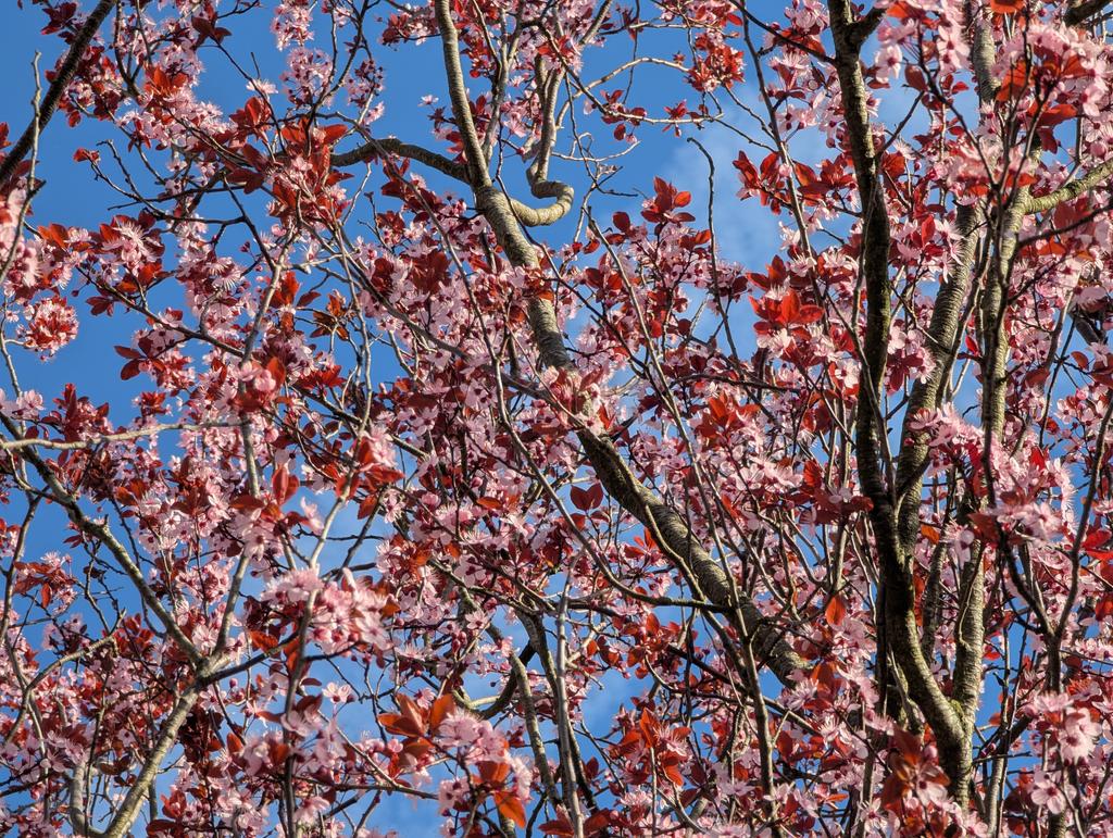 | Klaas die japanse kers heeft opvallende donkerrode tot purperen bladeren in combinatie met lichtroze bloesems prachtige foto. |