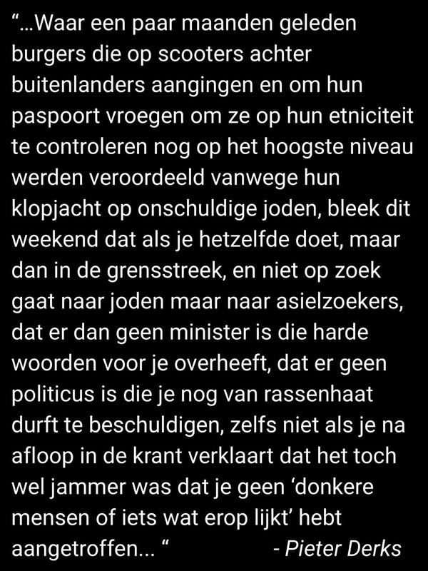 Ik hoorde een hele goede column van Pieter Derksen over die zg burgerwachten aan de grens. Hij vergeleek de reacties uit de politiek met die op de rellen na Ajax Maccabi- Tel Aviv van een paar maanden geleden. Toen werd er tot in de hoogste regionen tot aan de mp toe schande gesproken van jongeren die joden opjaagden en om hun identiteitsbewijs vroegen en werden hele bevolkingsgroepen neergezet als slecht geïntegreerd, terwijl burgers die op mensen met een kleurtje jagen en om hun id vragen met begrip worden benaderd en (Wilders) zelfs worden geprezen. Nee, het is niet de manier maar de minister begrijpt de frustratie.