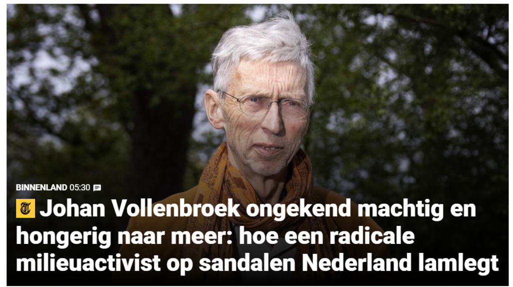 Een fraai staaltje van verbaal politiek geweld van de Telegraaf, stemmingmakerij, zo niet ophitsen van het volk. Natuurlijk heeft Vollenbroek gelijk. Hij vindt de milieumaatregelen niet uit maar wijst op de wetgeving en afspraken, zowel nationaal als internationaal en soms ook lokaal, zoals die vastgelegd zijn en die wetgeving is er natuurlijk niet voor niets. Het is natuurlijk te zot voor woorden dat hem en zijn mede-actievoerders verweten wordt de economie af te remmen, terwijl ze feitelijk niets meer doen dan dat, wijzen op wat er in de wet is vastgelegd. Het is ook precies wat Volkert van der Graaf deed, waardoor vooral veel grote boeren en de agro-industrie zijn bloed wel konden drinken. Helaas meende die doorgedraaide idioot dat het beter was om Pim Fortuyn dood te schieten waardoor het sprookje 'de kogel kwam van links' de wereld in geholpen werd en heden ten dage nog steeds doorklinkt. Ik ben zelf sinds mijn twintigste een aanhanger van Greenpeace geweest en heb nooit goed begrepen waarom kritiek op vervuilend beleid als (extreem)links wordt bestempeld. Als rechts het dan zo nodig vindt om het milieu te verpesten, dieren uit te laten sterven en natuurlijke bronnen uit te putten dan ben ik liever links. Dat ben ik ook, niet alleen om die reden.